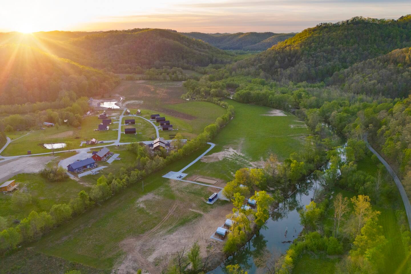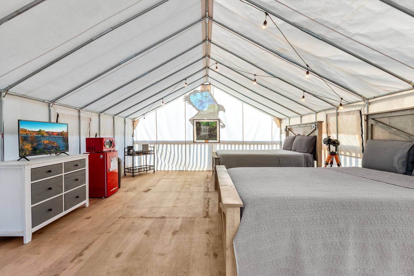 This listing offers 7 furnished glamping tents along with a bath house, making it the perfect retreat for various occasions, such as family reunions and small weddings. The Rio Rojo Community, located just steps away from the calm waters of the Red River. The fully equipped sanctuary includes a volleyball court, smart TVs, fans, coffee stations, mini-fridges, microwaves, internet access, firepits, grills, and access to a bath house, providing a range of amenities for a truly relaxing experience.