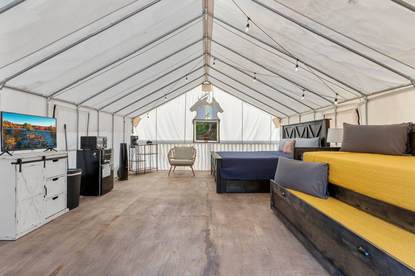 Embrace Nature! A true fancy camping (GLAMPING) experience. Description: Welcome to our enchanting glamping experience, where nature meets comfort in a unique canvas setting. As stewards of the great outdoors, we want you to fully immerse yourself in the beauty of crisp nights and starlit skies. Please note that our tent is a true canvas structure without insulation, meaning that temperatures inside may reflect the cooler or warmer weather outside. While being canvas, this also means that it is nearly waterproof, however, wind can blow water underneath during bad storms. Chilly Nights, Cozy Comfort: As the sun sets and temperatures drop, we invite you to relish the authentic experience of feeling the natural elements. To enhance your comfort, we provide a heated mattress cover and an electric blanket. While these may not keep you toasty, you may want to pack additional belongings and plan accordingly for chilly nights. What to Pack: Given the open-air design of the tent, we recommend packing accordingly for chilly nights. Bring your favorite cozy pajamas, warm socks, and perhaps even your go-to winter attire for an extra layer of warmth. It is all part of the immersive experience, allowing you to fully enjoy the magical ambiance of our glamping retreat. Winter Wonderland Attire: Cozy pajamas Warm socks Layers for extra warmth Snuggly blankets for that extra touch of comfort Sleeping Bags to proper temp ratings